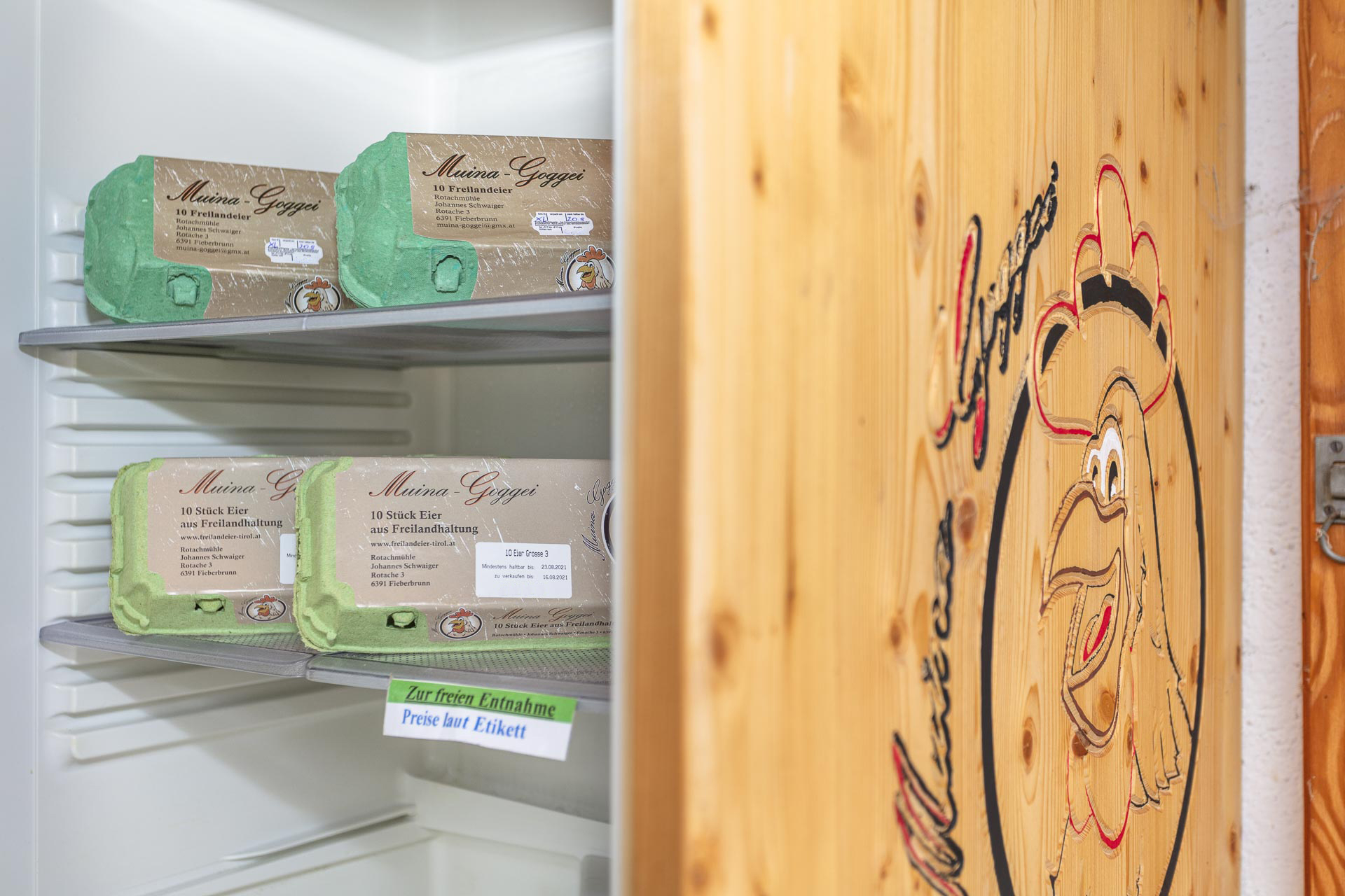 Qualitativ hochwertige Eier von glücklichen Hühnern direkt aus Fieberbrunn erhaltet ihr in unserem Selbstbedienungsschrank. Dieser ist jederzeit für euch geöffnet.